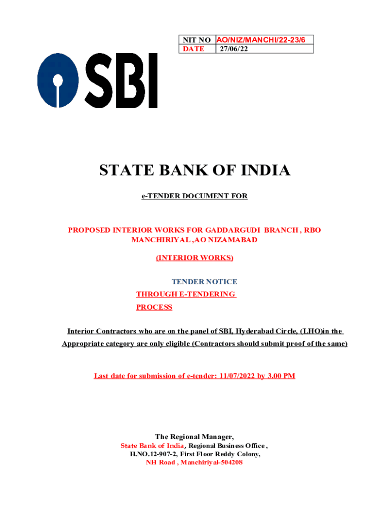 Get the free NIT No. AO/NIZ/MANCHI/22-23/7 DATE 27.06 - SBI