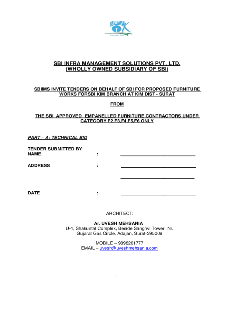 SBI INFRA MANAGEMENT SOLUTIONS PVT. LTD. (WHOLLY OWNED SUBSIDIARY OF SBI)SBI IMS INVITE TENDERS ON BEHALF OF SBI FOR PROPOSED FURNITURE WORKS FOR SBI KIM BRANCH AT KIM DIST SURAT FROM THE SBI APPROVED