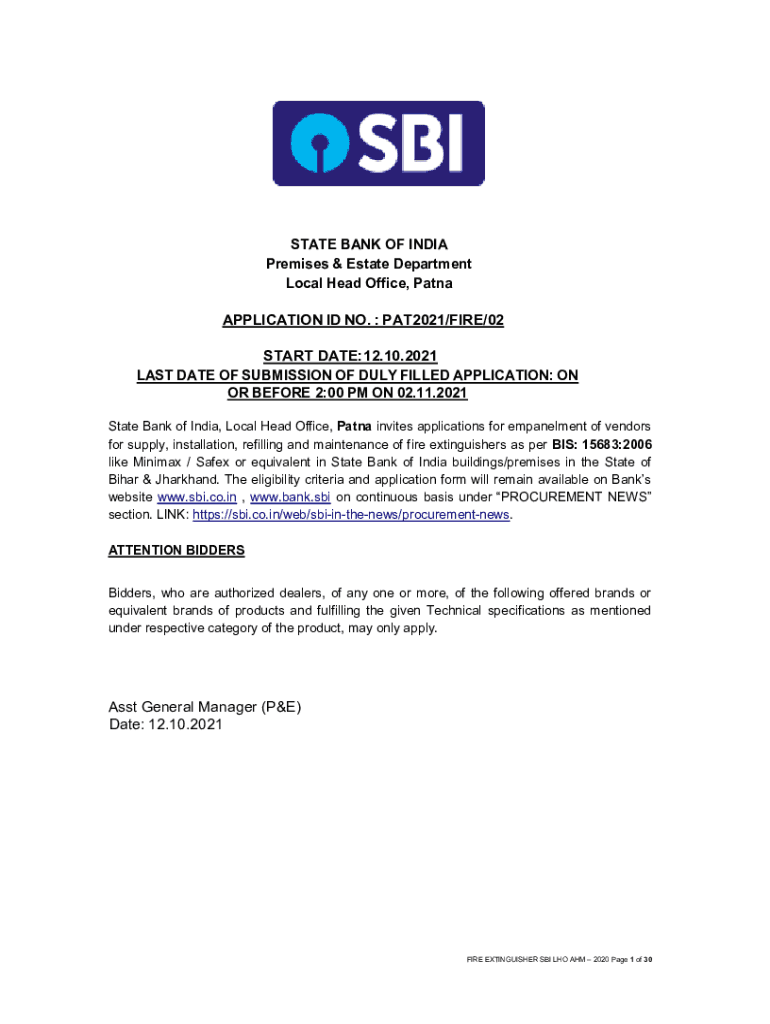 STATE BANK OF INDIA Premises & Estate Department Local Head Office, PatnaAPPLICATION ID NO. PAT2021/FIRE/02 START DATE:12.10.2021 LAST DATE OF SUBMISSION OF DULY FILLED APPLICATION: ON OR BEFORE 2:00