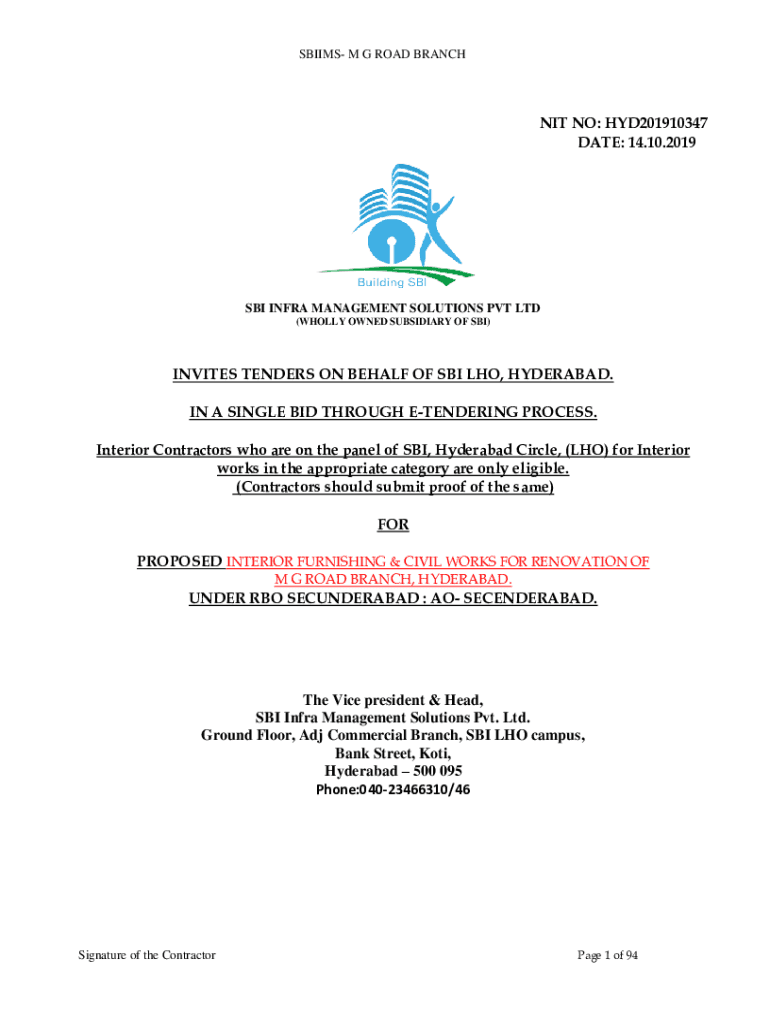 SBI IMS M G ROAD BRANCH NO: HYD201910347 DATE: 14.10.2019SBI INFRA MANAGEMENT SOLUTIONS PVT LTD (WHOLLY OWNED SUBSIDIARY OF SBI)INVITES TENDERS ON BEHALF OF SBI WHO, HYDERABAD. IN A SINGLE BID THROUGH