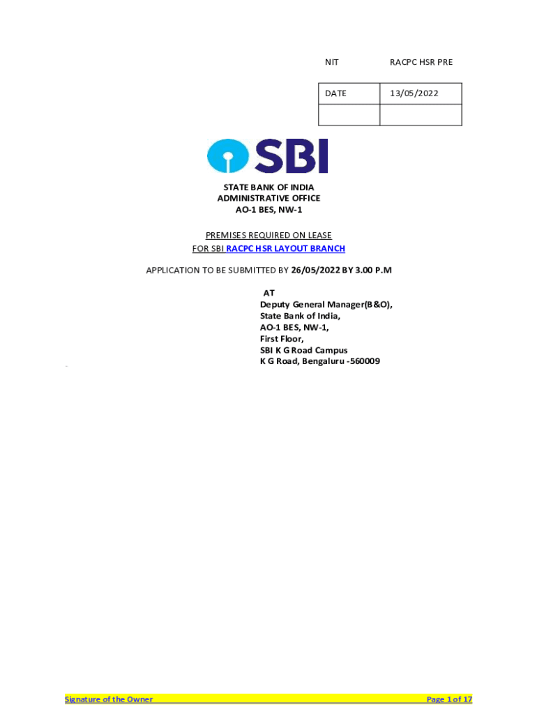 NITRATE HER PREDATE13/05/2022STATE BANK OF INDIA ADMINISTRATIVE OFFICE AO1 BES, NW1 PREMISES REQUIRED ON LEASE FOR SBI RAC PC HER LAYOUT BRANCH APPLICATION TO BE SUBMITTED BY 26/05/2022 BY 3.00 P.