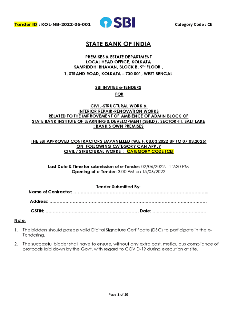 Category Code : Defender ID : KOLNB202206001STATE BANK OF INDIA PREMISES & ESTATE DEPARTMENT LOCAL HEAD OFFICE, KOLKATA PARIDHI HAVEN, BLOCK B, 9TH FLOOR, 1, STRAND ROAD, KOLKATA 700 001, WEST BENGAL