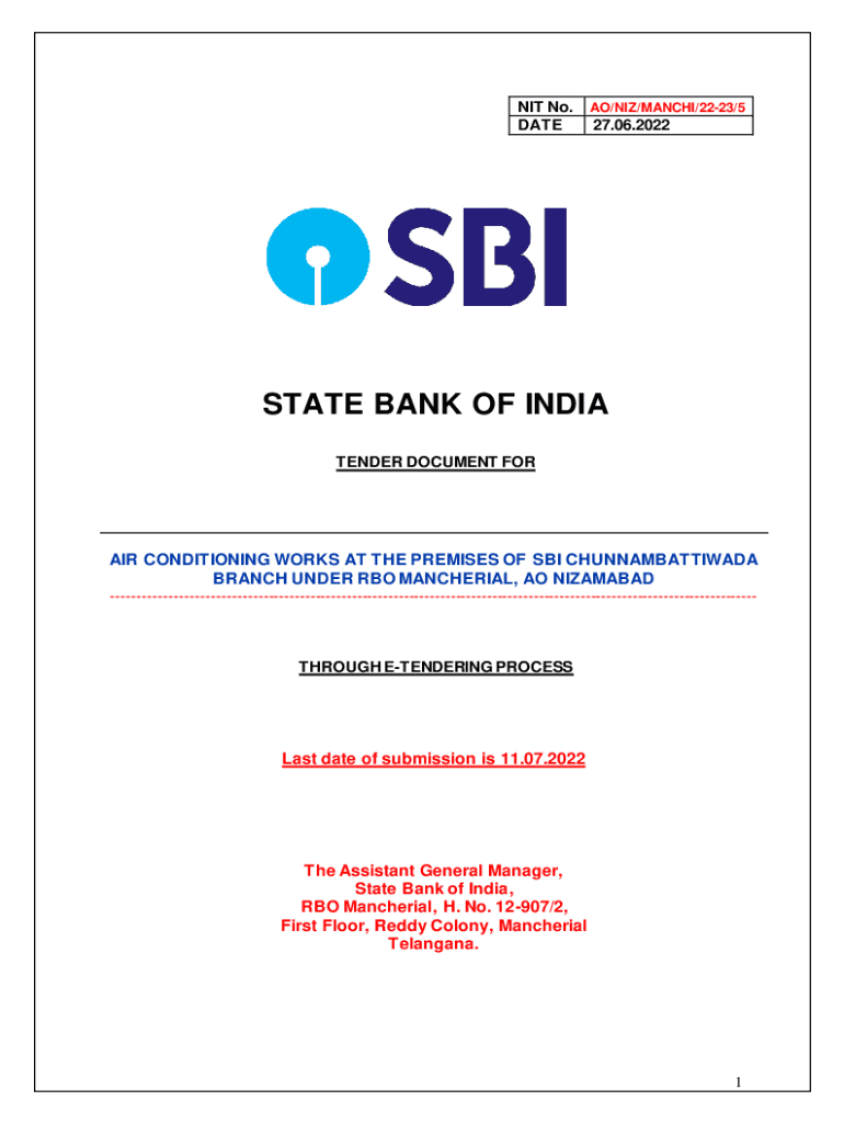NIT No. DAT EAO/LIZ/MANCHU/2223/527.06.2022STATE BANK OF INDIA TENDER DOCUMENT FORA IR CONDITIONING WORKS AT THE PREMISES OF SBI CHUNNAMBATTIWADA BRANCH UNDER HBO MANAGERIAL, AO ISLAMABAD THROUGH