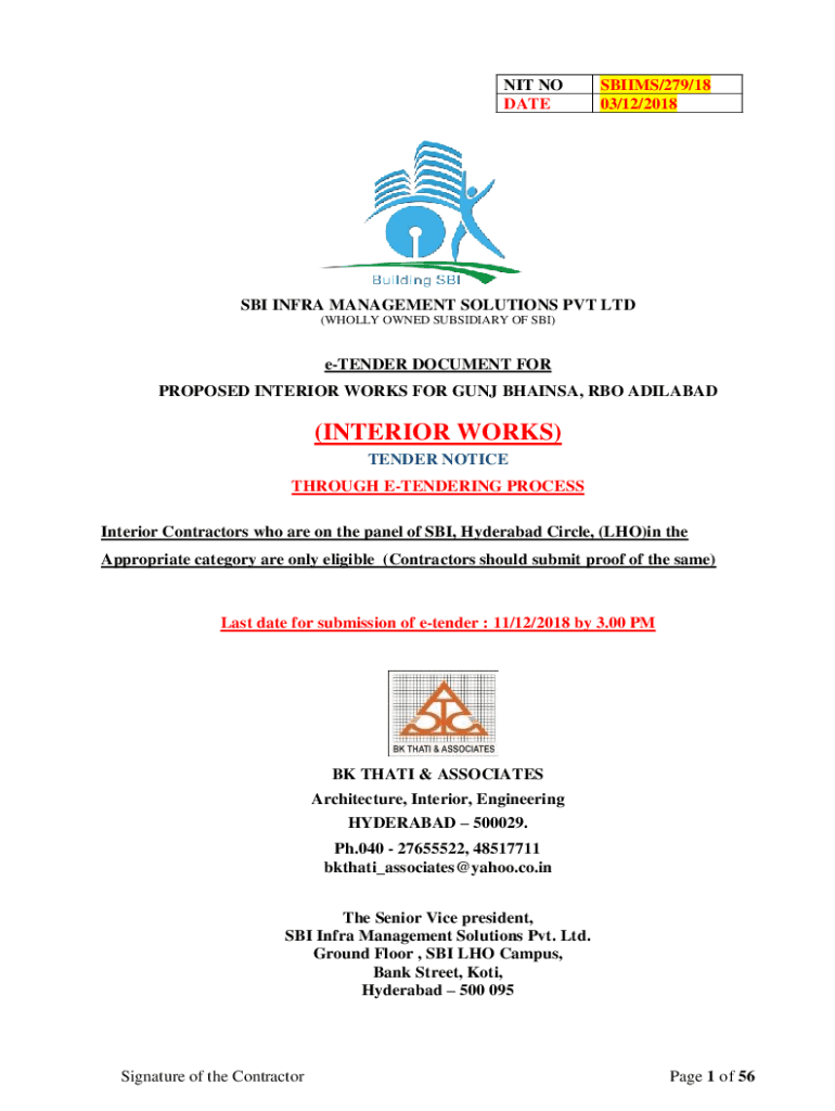 NIT NO DATESBIIMS/279/18 03/12/2018SBI INFRA MANAGEMENT SOLUTIONS PVT LTD (WHOLLY OWNED SUBSIDIARY OF SBI)tender DOCUMENT FOR PROPOSED INTERIOR WORKS FOR GUN BHA INSA, HBO SADIQABAD(INTERIOR WORKS)
