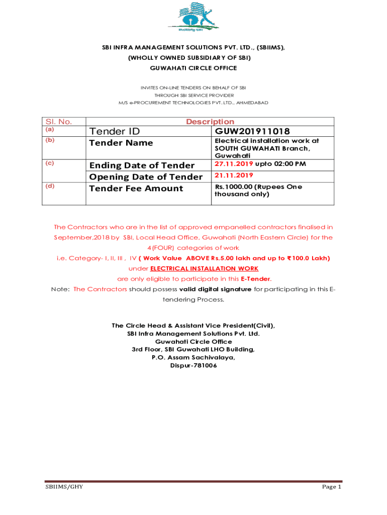 SBI INFRA MANAGEMENT SOLUTIONS PVT. LTD., (SBI IMS), (WHOLLY OWNED SUBSIDIARY OF SBI) GUWAHATI CIRCLE OFFICE INVITES ONLINE TENDERS ON BEHALF OF SBI THROUGH SBI SERVICE PROVIDER M/Se PROCUREMENT TECHNOLOGIES