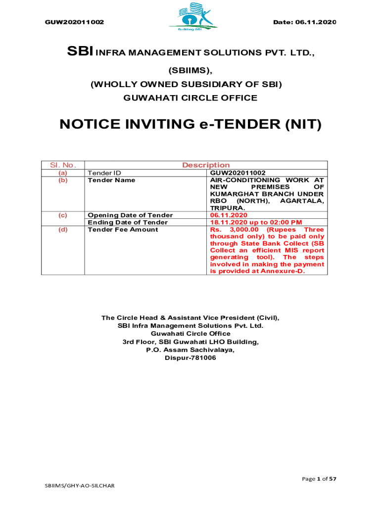 GUW202011002Date: 06.11.2020SBI INFRA MANAGEMENT SOLUTIONS PVT. LTD., (SBI IMS), (WHOLLY OWNED SUBSIDIARY OF SBI) GUWAHATI CIRCLE OFFICENOTICE INVITING tender (NIT) SL. No. Description(a) (b)Tender
