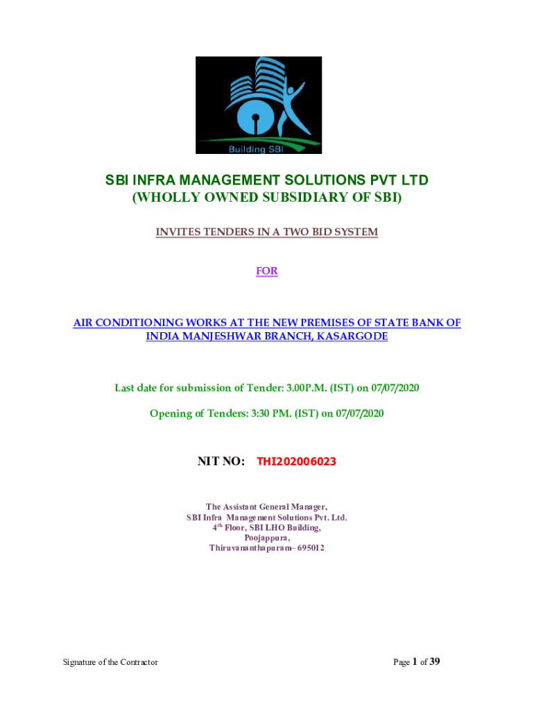 SBI INFRA MANAGEMENT SOLUTIONS PVT LTD (WHOLLY OWNED SUBSIDIARY OF SBI) INVITES TENDERS IN A TWO BID SYSTEM FORA IR CONDITIONING WORKS AT THE NEW PREMISES OF STATE BANK OF INDIA MANJUSHA BRANCH, KASARGODELast