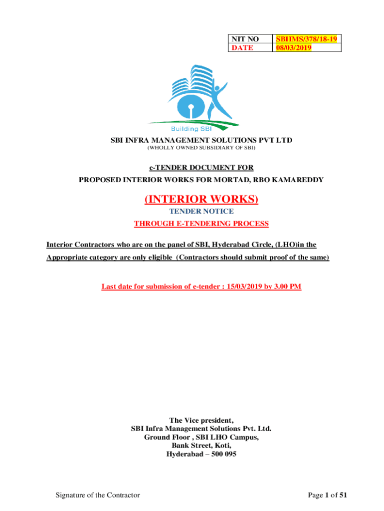 NIT NO DATESBIIMS/378/1819 08/03/2019SBI INFRA MANAGEMENT SOLUTIONS PVT LTD (WHOLLY OWNED SUBSIDIARY OF SBI)tender DOCUMENT FOR PROPOSED INTERIOR WORKS FOR MORTAL, HBO KAMAREDDY(INTERIOR WORKS) TENDER