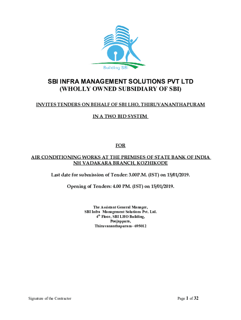 SBI INFRA MANAGEMENT SOLUTIONS PVT LTD (WHOLLY OWNED SUBSIDIARY OF SBI) INVITES TENDERS ON BEHALF OF SBI WHO, THIRUVANANTHAPURAM IN A TWO BID SYSTEM AIR CONDITIONING WORKS AT THE PREMISES OF STATE