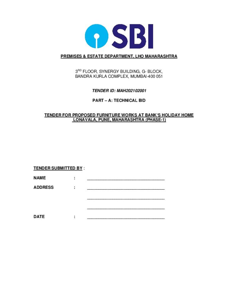 PREMISES & ESTATE DEPARTMENT, WHO MAHARASHTRA3RD FLOOR, SYNERGY BUILDING, G BLOCK, SANDRA KARLA COMPLEX, MUMBAI400 051TENDER ID: MAH202102001 PART A: TECHNICAL BUDTENDER FOR PROPOSED FURNITURE WORKS
