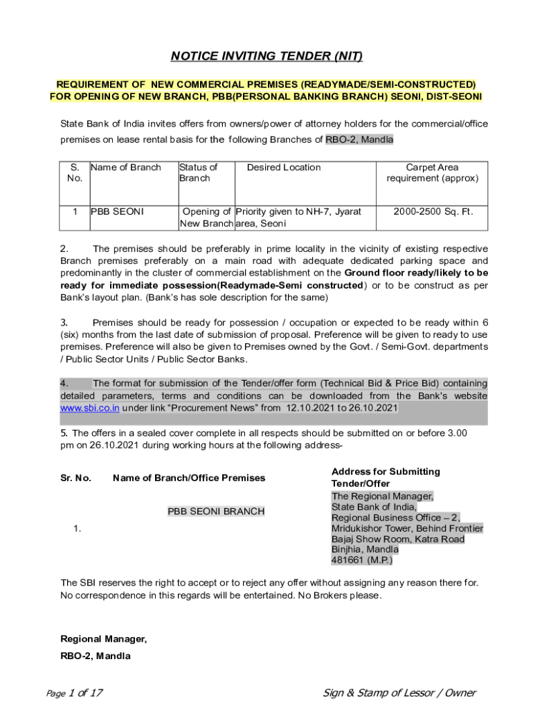 NOTICE INVITING TENDER (NIT) REQUIREMENT OF NEW COMMERCIAL PREMISES (REMADE/RECONSTRUCTED) FOR OPENING OF NEW BRANCH, PBB(PERSONAL BANKING BRANCH) SEO NI, DISSENT State Bank of India invites offers
