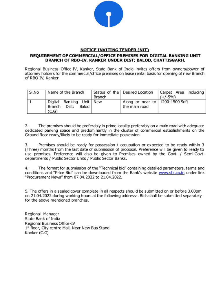 NOTICE INVITING TENDER (NIT) REQUIREMENT OF COMMERCIAL/OFFICE PREMISES FOR DIGITAL BANKING UNIT BRANCH OF BOIL, BANKER UNDER DIST; BALD, CHHATTISGARH. Regional Business Office IV, Banker, State Bank