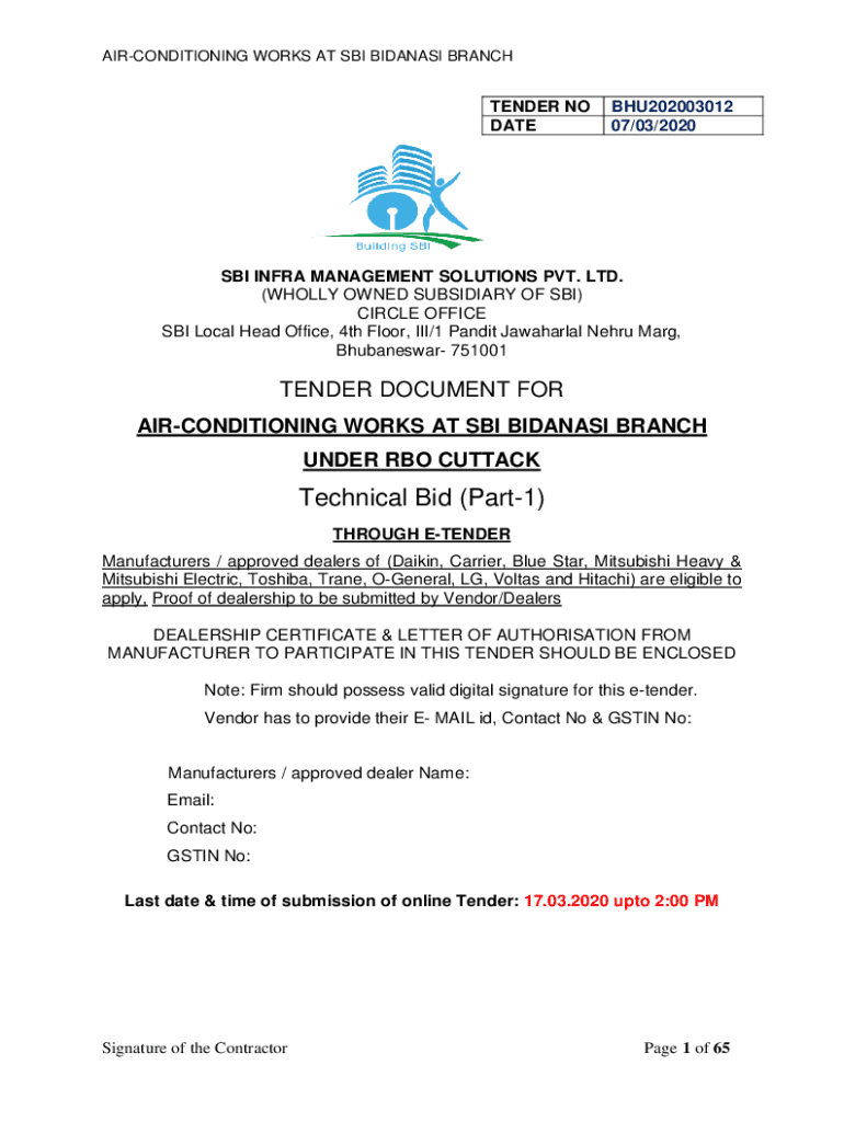 AIR-CONDITIONING WORKS AT SBI BANANAS BRANCHTENDER NO DATEBHU202003012 07/03/2020SBI INFRA MANAGEMENT SOLUTIONS PVT. LTD. (WHOLLY OWNED SUBSIDIARY OF SBI) CIRCLE OFFICE SBI Local Head Office, 4th
