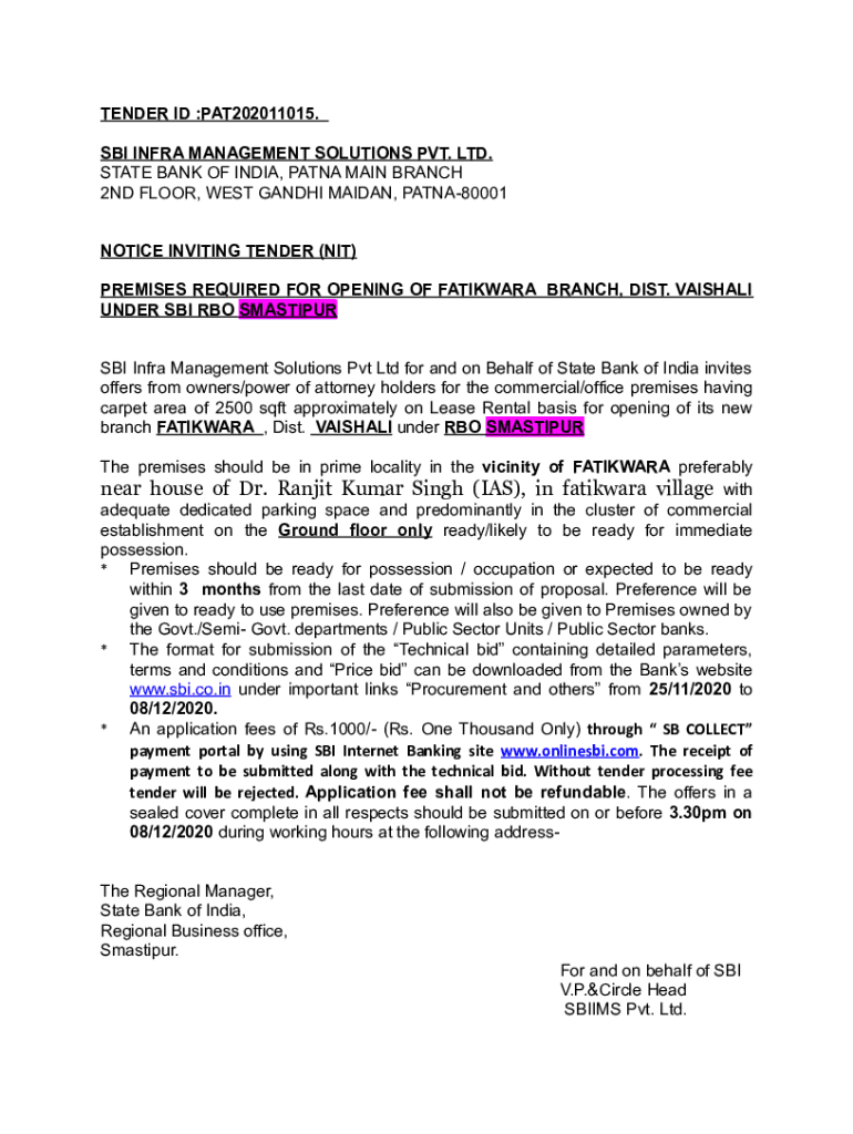 TENDER ID :PAT202011015. SBI INFRA MANAGEMENT SOLUTIONS PVT. LTD. STATE BANK OF INDIA, PATNA MAIN BRANCH 2ND FLOOR, WEST GANDHI MAIDAN, PATNA80001 NOTICE INVITING TENDER (NIT) PREMISES REQUIRED FOR
