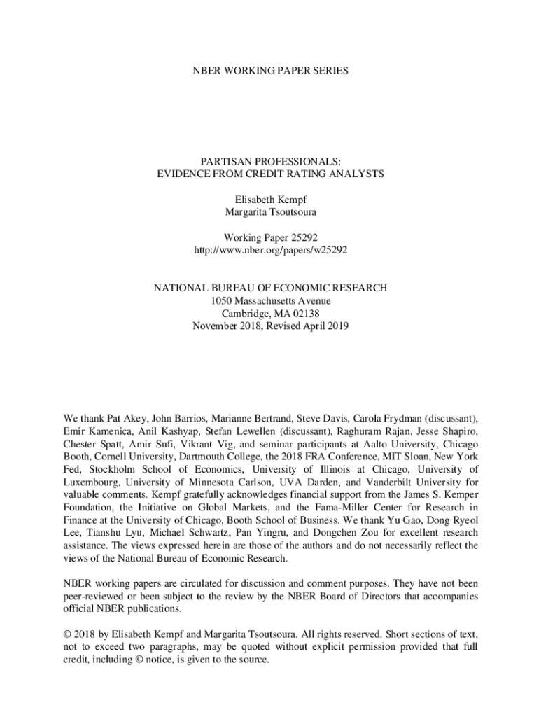 BER WORKING PAPER SERIESPARTISAN PROFESSIONALS: EVIDENCE FROM CREDIT RATING ANALYSTS Elisabeth Kemp Margarita Tsoutsoura Working Paper 25292 http://www.nber.org/papers/w25292NATIONAL BUREAU OF ECONOMIC
