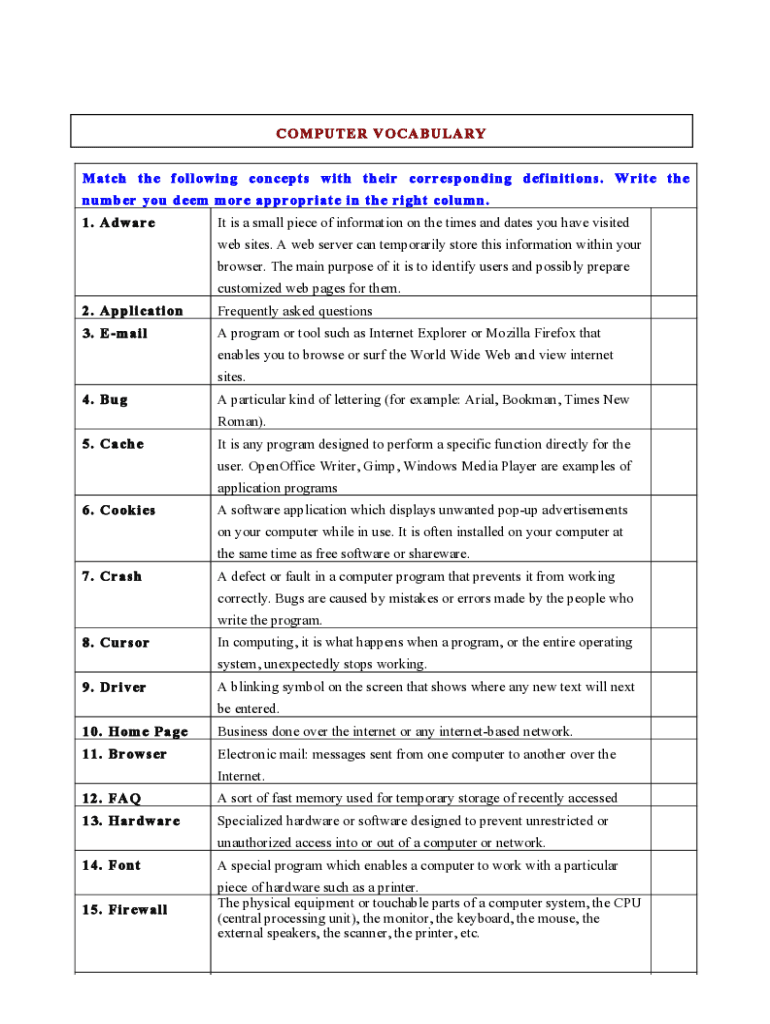 COM PETER VOCABULARY Match the following concepts with their corresponding definitions. W rite the number you deem m ore appropriate in the right column. 1. Adware It is a small piece of information