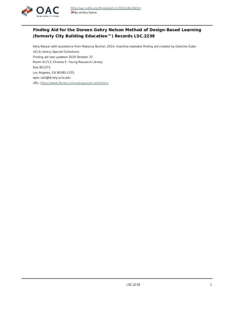 HTTP://oac.cdlib.org/findaid/ark:/13030/c8p55t3m No online itemsFinding Aid for the Doreen Gerry Nelson Method of Designated Learning (formerly City Building Education) Records LSC.2239 Kelly Lesser