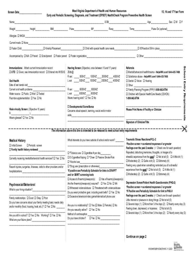 Screen Date___West Virginia Department of Health and Human Resources Early and Periodic Screening, Diagnosis, and Treatment (EPS DT) Hatcheck Program Preventive Health Screen15, 16 and 17 Year Forename___