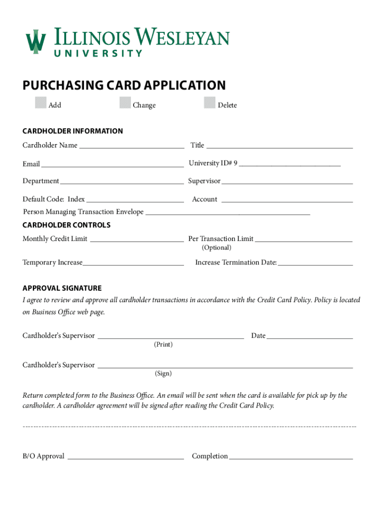 PURCHASING CARD APPLICATIONAddChangeDeleteCARDHOLDER INFORMATION Cardholder Name ___ Title ___ Email ___ University ID# 9 ___ Department ___ Supervisor ___ Default Code: Index ___Account ___Person