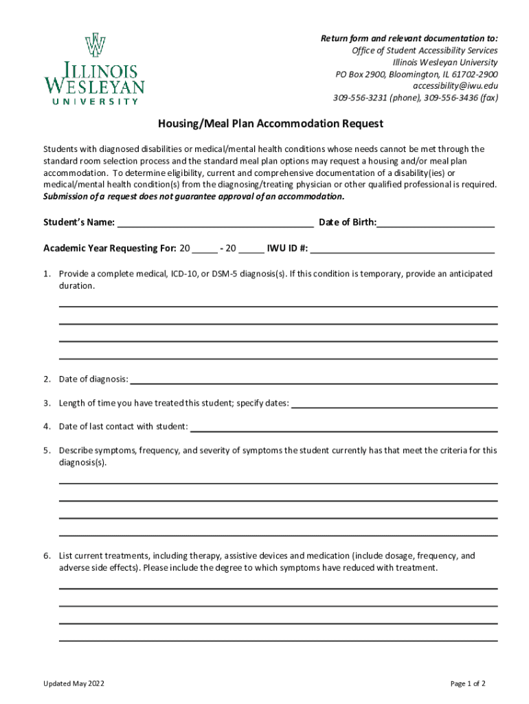 Return form and relevant documentation to: Office of Student Accessibility Services Illinois Wesleyan University PO Box 2900, Bloomington, IL 617022900 accessibility@iwu.edu 3095563231 (phone), 3095563436