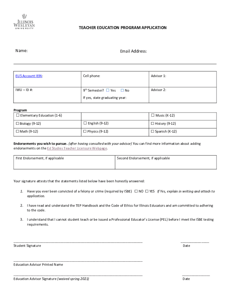 TEACHER EDUCATION PROGRAM APPLICATIONName:Email Address:ELLIS Account VEIN:Cell phone:ICU ID #:9th Semester? Advisor 1: Advisor 2:If yes, state graduating year: Program Elementary Education (16) Music