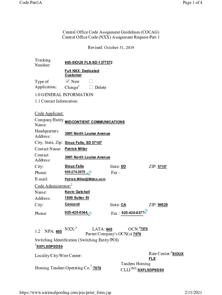 Code Part1APage 1 of 4Central Office Code Assignment Guidelines (COCA) Central Office Code (NIX) Assignment Requester 1 Revised: October 31, 2019, Tracking Number:605SIOUX FLSSD1377572 Full NIX: Dedicated