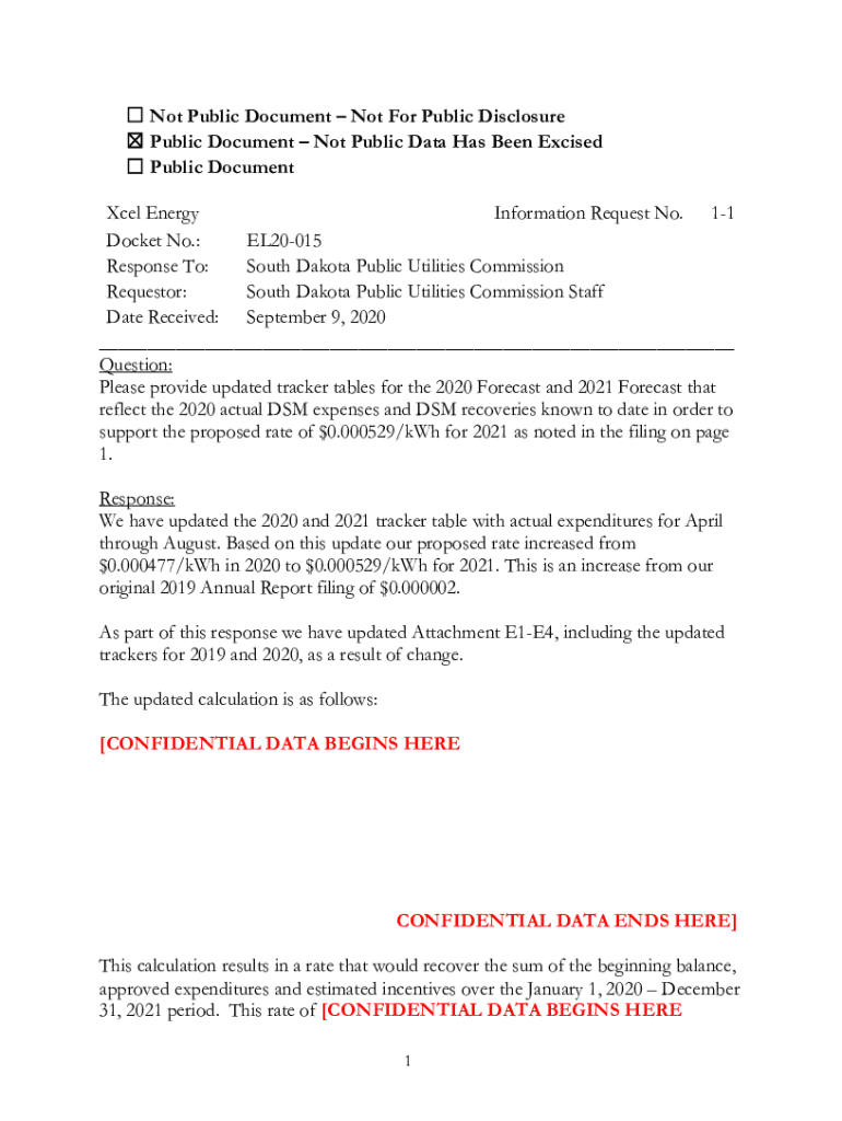 Not Public Document Not For Public Disclosure Public Document Not Public Data Has Been Excised Public Document Excel Energy Information Request No. 11 Docket No.: EL20015 Response To: South Dakota