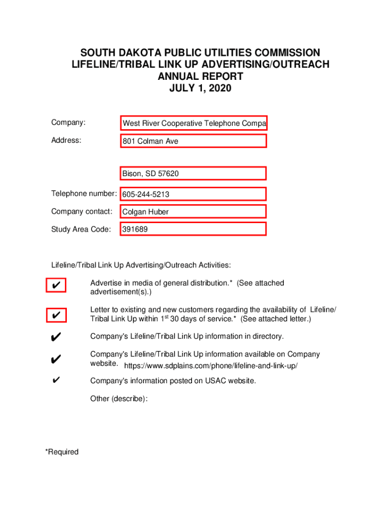 SOUTH DAKOTA PUBLIC UTILITIES COMMISSION LIFELINE/TRIBAL LINK UP ADVERTISING/OUTREACH ANNUAL REPORT JULY 1, 2020, Company:West River Cooperative Telephone CompanyAddress:801 Colman Aversion, SD 57620