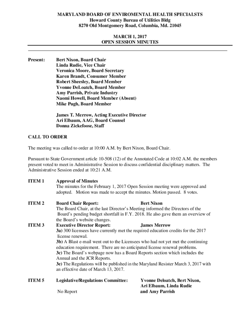 MARYLAND BOARD OF ENVIRONMENTAL HEALTH SPECIALISTS Howard County Bureau of Utilities Bldg 8270 Old Montgomery Road, Columbia, Md. 21045 MARCH 1, 2017, OPEN SESSION MINUTES ___ Present:Bert Nixon,