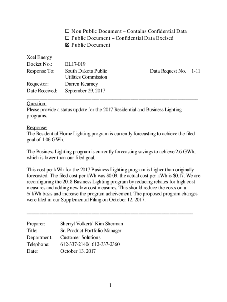 N on Public Document Contains Confidential Data Public Document Confidential Data Excised Public Document Excel Energy Docket No.: Response To:EL17019 Data Request No. 111 South Dakota Public Utilities