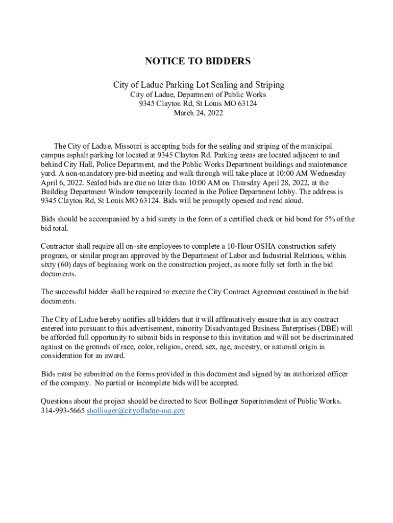 NOTICE TO BIDDERS City of Ladle Parking Lot Sealing and Striping City of Ladle, Department of Public Works 9345 Clayton Rd, St Louis MO 63124 March 24, 2022The City of Ladle, Missouri is accepting
