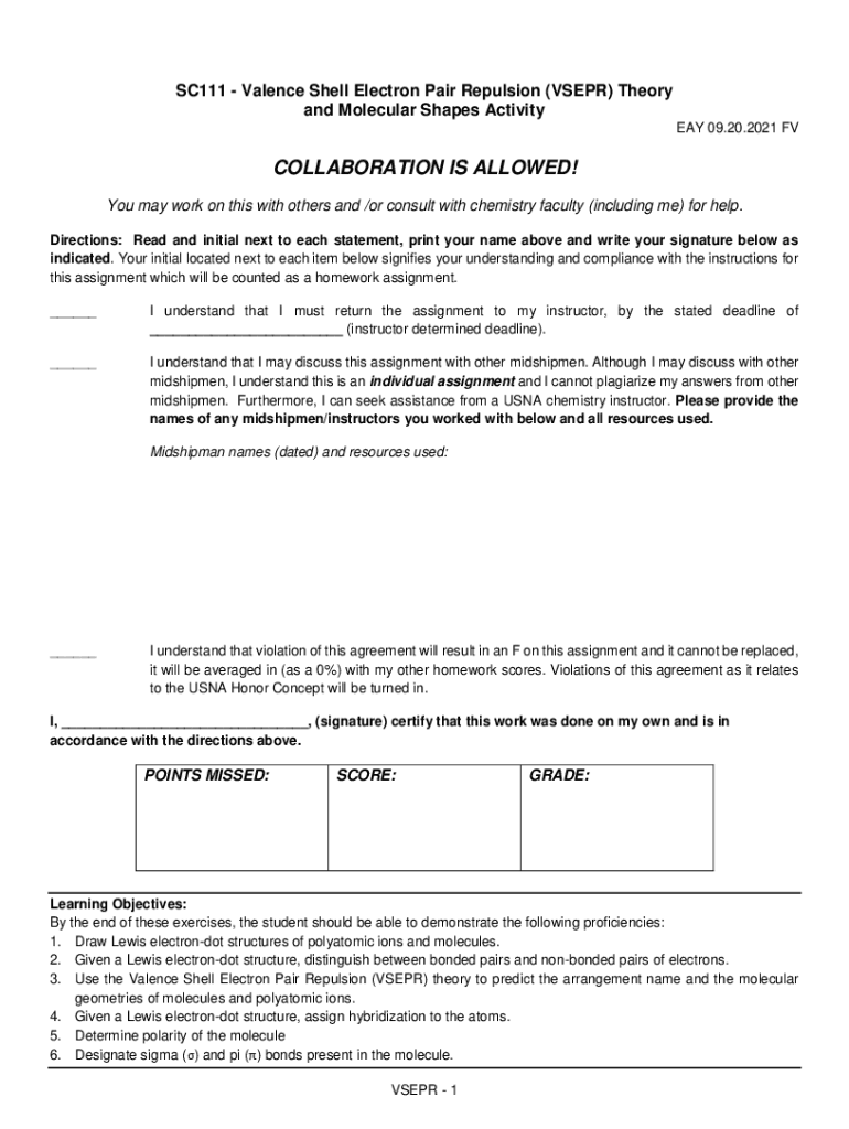 SC111 Valence Shell Electron Pair Repulsion (VS EPR) Theory and Molecular Shapes Activity EAY 09.20.2021 COLLABORATION IS ALLOWED! You may work on this with others and /or consult with chemistry faculty