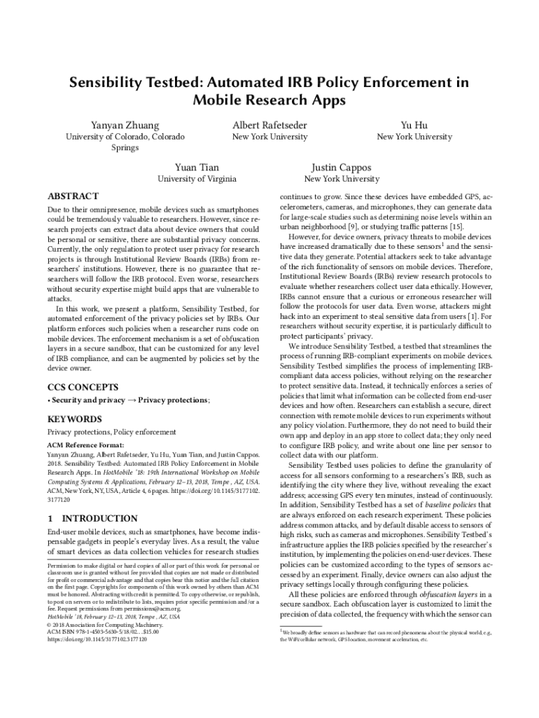Sensibility Tested: Automated IRB Policy Enforcement in Mobile Research Apps Banyan ZhuangUniversity of Colorado, Colorado Springs Albert RafetsederYuan TianUniversity of VirginiaABSTRACT Due to their