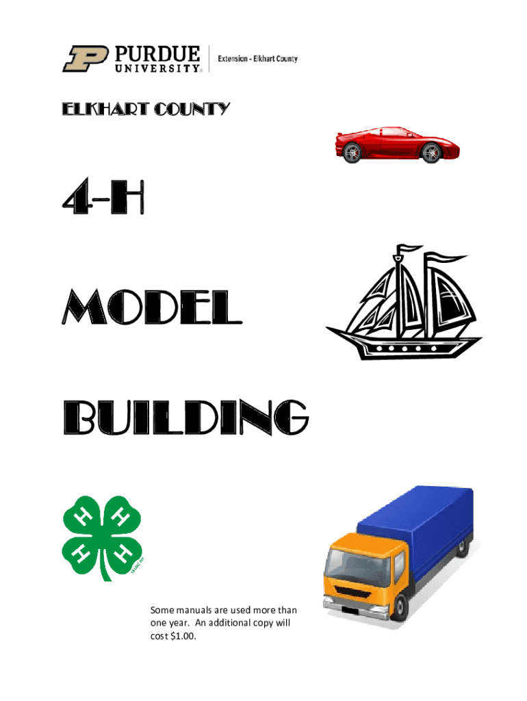 ELKHART COUNTY4H MODEL Buildings manuals are used more than one year. An additional copy will cost $1.00.UPDATED: DECEMBER 2018REQUIREMENTS FOR 4H MODEL BUILDING PROJECT AND EXHIBIT 1. 2. 3. Read