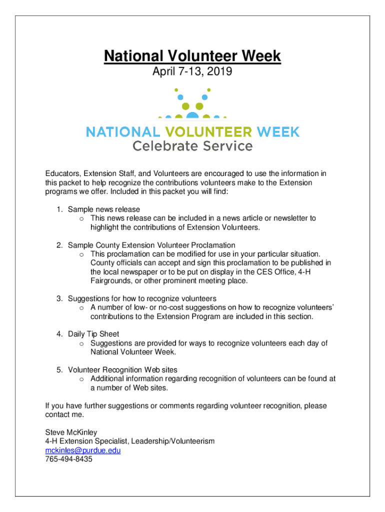 National Volunteer Week April 713, 2019Educators, Extension Staff, and Volunteers are encouraged to use the information in this packet to help recognize the contributions volunteers make to the Extension