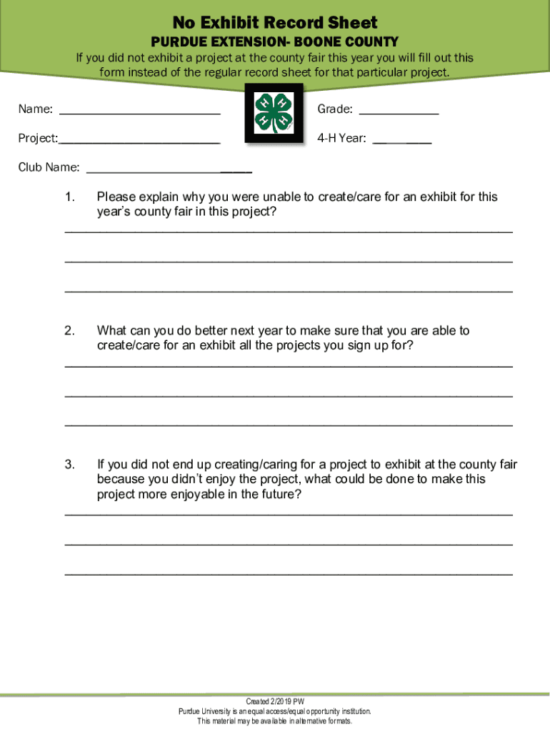No Exhibit Record SheetPURDUE EXTENSION Boone County you did not exhibit a project at the county fair this year you will fill out this form instead of the regular record sheet for that particular