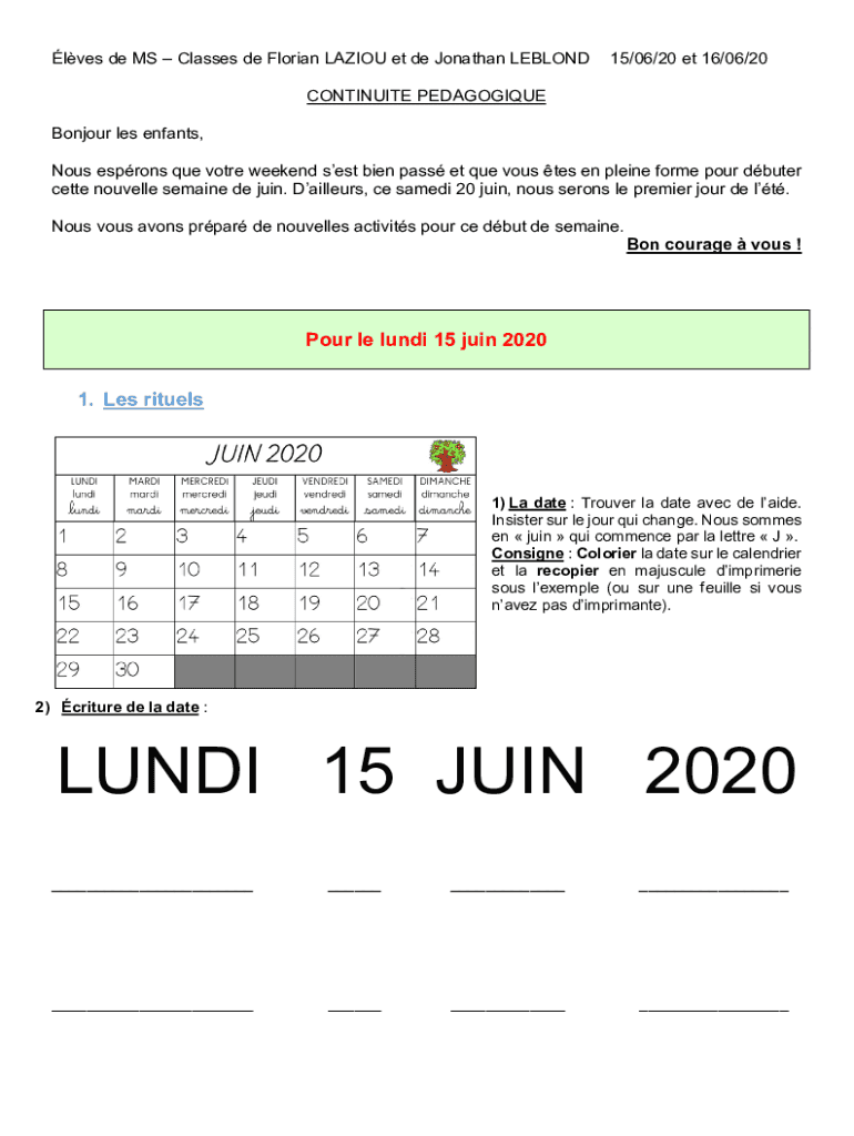 Lies de MS Classes de Florian LAZ IOU et de Jonathan LEBLOND15/06/20 ET 16/06/20CONTINUITE PEDAGOGUE Bonjour fewer infants, Nous spoons Que vote weekend set Bain pass et Que vows TES en plane form