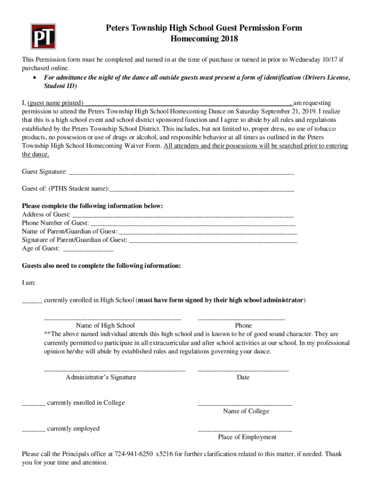 Peters Township High School Guest Permission Form Homecoming 2018 This Permission form must be completed and turned in at the time of purchase or turned in prior to Wednesday 10/17 if purchased online.