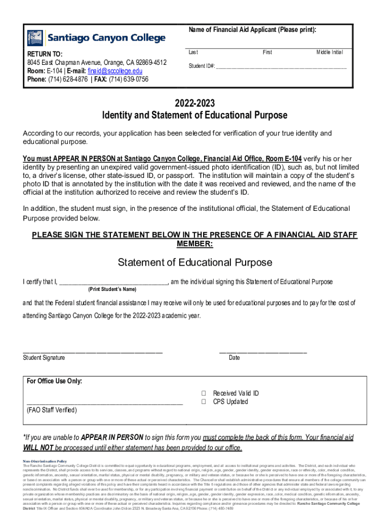 Name of Financial Aid Applicant (Please print): RETURN TO: 8045 East Chapman Avenue, Orange, CA 928694512 Room: E104 | Email: finaid@sccollege.edu Phone: (714) 6284876 | FAX: (714) 6390756LastFirstMiddle