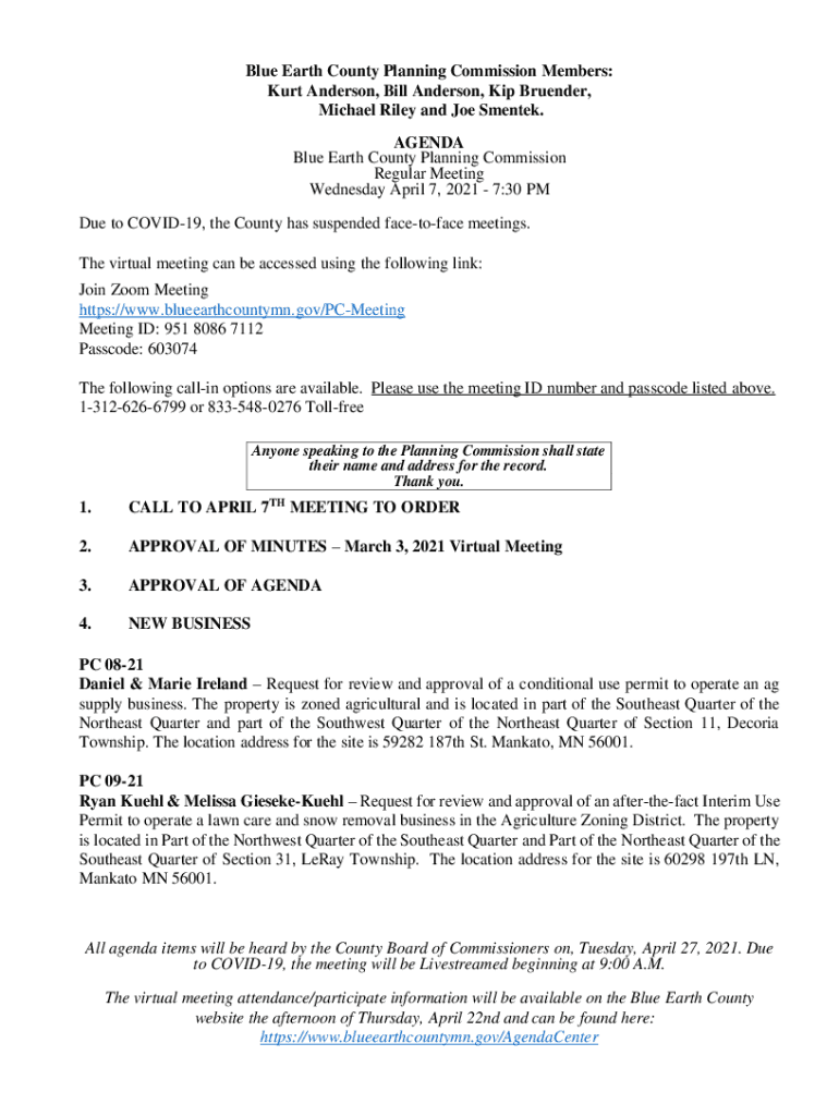 Blue Earth County Planning Commission Members: Kurt Anderson, Bill Anderson, Kip Render, Michael Riley and Joe Scented. AGENDA Blue Earth County Planning Commission Regular Meeting Wednesday, April