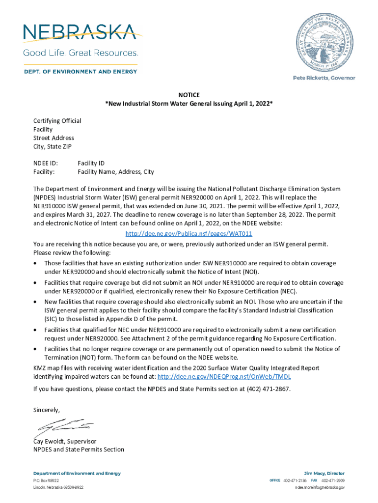 NOTICE *New Industrial Storm Water General Issuing April 1, 2022* Certifying Official Facility Street Address City, State ZIP DEE ID: Facility:Facility ID Facility Name, Address, City Department of