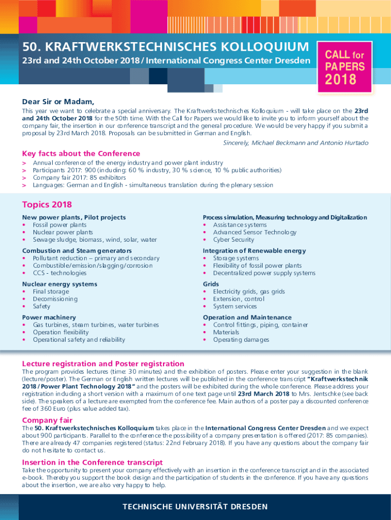 50. KRAFTWERKSTECHNISCHES COLLOQUIUM 23rd and 24th October 2018 / International Congress Center DresdenCALL for PAPERS2018Dear Sir or Madam, This year we want to celebrate a special anniversary. The