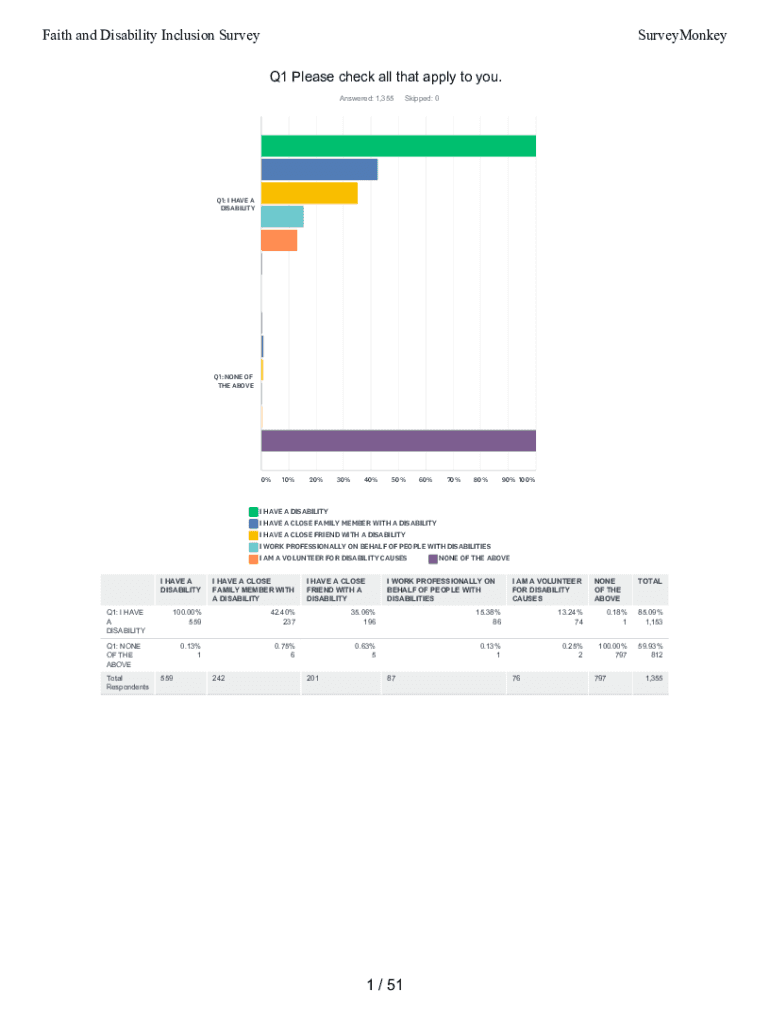 Faith and Disability Inclusion SurveySurveyMonkey Q1 Please check all that apply to you. Answered: 1,355Skipped: 0Q1: I HAVE A DISABILITYQ1: NONE OF THE ABOVE0%10%20%30%40%50%60%70%80%90% 100%I HAVE