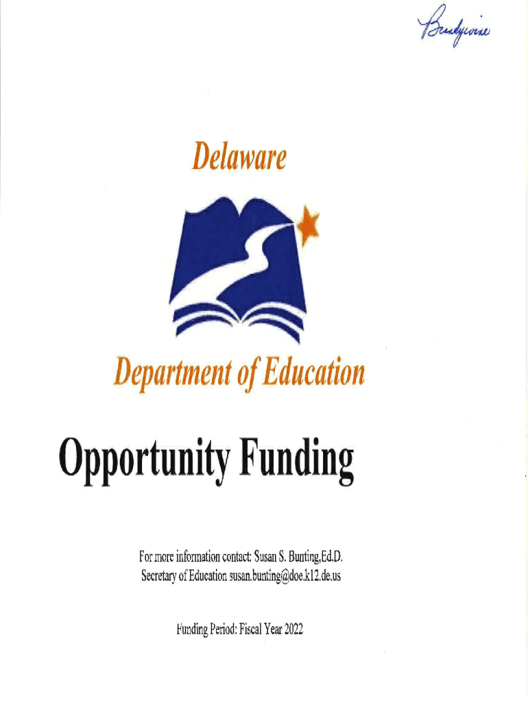 DelawareDepartment of EducationOpportunity Funding For more information contact: Susan S. Bunting, Ed. D. Secretary of Education susan.bunting@doe.kl2.de.usFunding Period: Fiscal Year 2022Delaware
