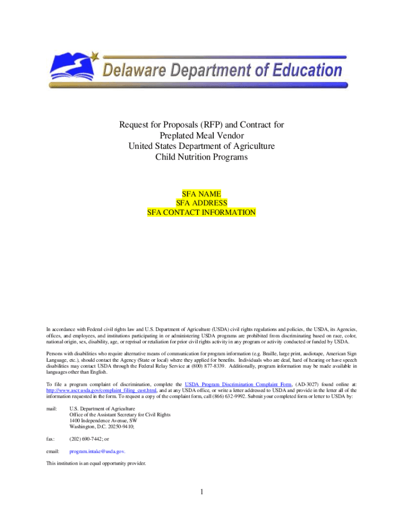 Request for Proposals (RFP) and Contract for Preplaced Meal Vendor United States Department of Agriculture Child Nutrition Programs NAME SFA ADDRESS SFA CONTACT INFORMATION In accordance with Federal