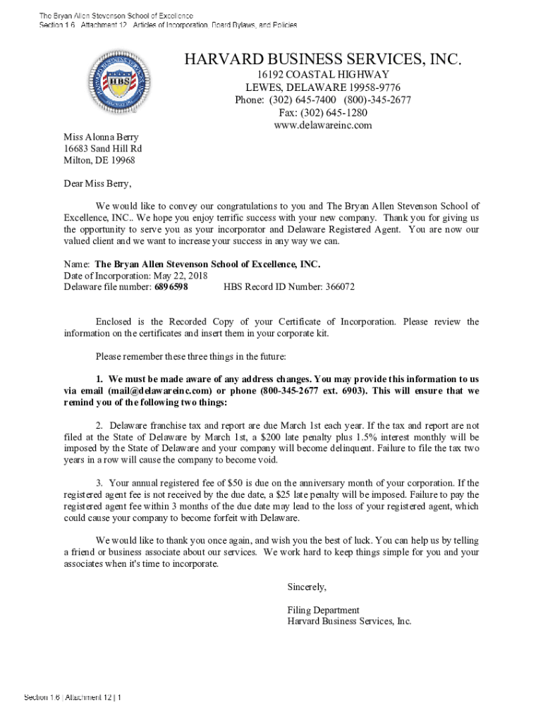 HARVARD BUSINESS SERVICES, INC. 16192 COASTAL HIGHWAY LEWIS, DELAWARE 199589776 Phone: (302) 6457400 (800)3452677 Fax: (302) 6451280 www.delawareinc.com Miss Along Berry 16683 Sand Hill Rd Milton,