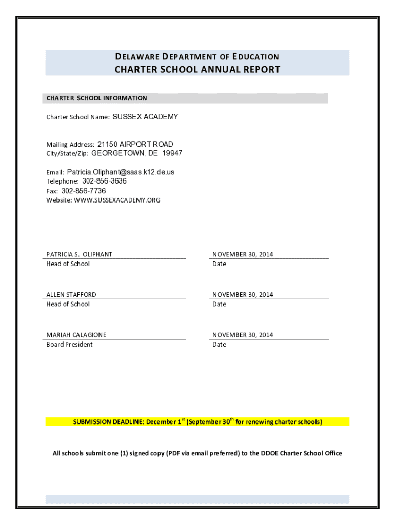 D DELAWARE D DEPARTMENT E EDUCATION CHARTER SCHOOL ANNUAL REPORT CHARTERSCHOOLINFORMATION CharterSchoolName:SUSSEX ACADEMY MailingAddress:21150 AIRPORT ROAD City/State/Zip:GEORGETOWN, DE 19947 Email:Patricia.Oliphant@saas.k12.de.us