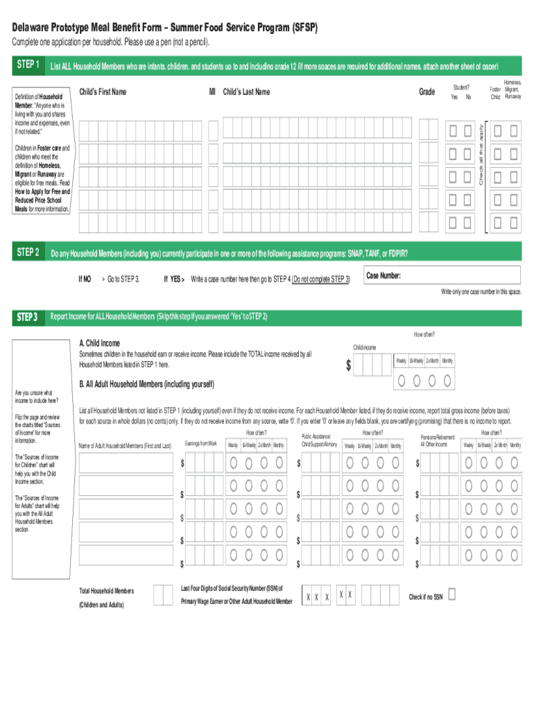 Delaware Prototype Meal Benefit Form Summer Food Service Program (SSP) Complete one application per household. Please use a pen (not a pencil). List ALL Household Members who are infants, children,