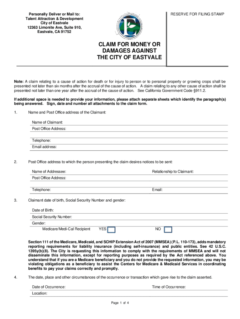 Personally Deliver or Mail to: Talent Attraction & Development City of East vale 12363 Lignite Ave, Suite 910, East vale, CA 91752RESERVE FOR FILING STAMPCLAIM FOR MONEY OR DAMAGES AGAINST THE CITY