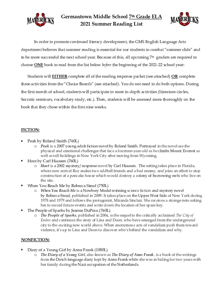 Germantown Middle School 7th Grade ELA 2021 Summer Reading List In order to promote continued literacy development, the GMS English Language Arts department believes that summer reading is essential